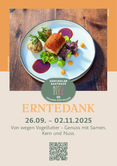 Von wegen Vogelfutter – Genuss mit Samen, Kern & Nuss“ lautet das Motto der Südtiroler Gasthäuser während der gastronomischen Aktionswochen „Erntedank“. Im Fokus stehen dabei kreative und besondere kulinarische Kreationen, die den Geschmack und die Vielfalt der herbstlichen Zutaten in den Mittelpunkt rücken.