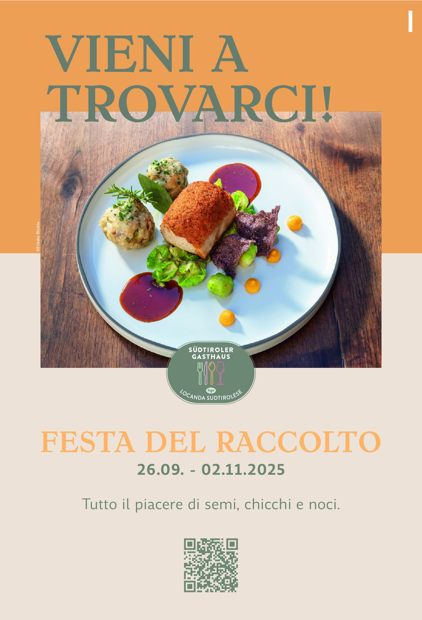 «Tutto il piacere di semi, chicchi e noci.» è il motto delle locande altoatesine durante le settimane gastronomiche “Festa del Ringraziamento”. Al centro dell’attenzione ci sono creazioni culinarie creative e particolari, che mettono in risalto il sapore e la varietà degli ingredienti autunnali.